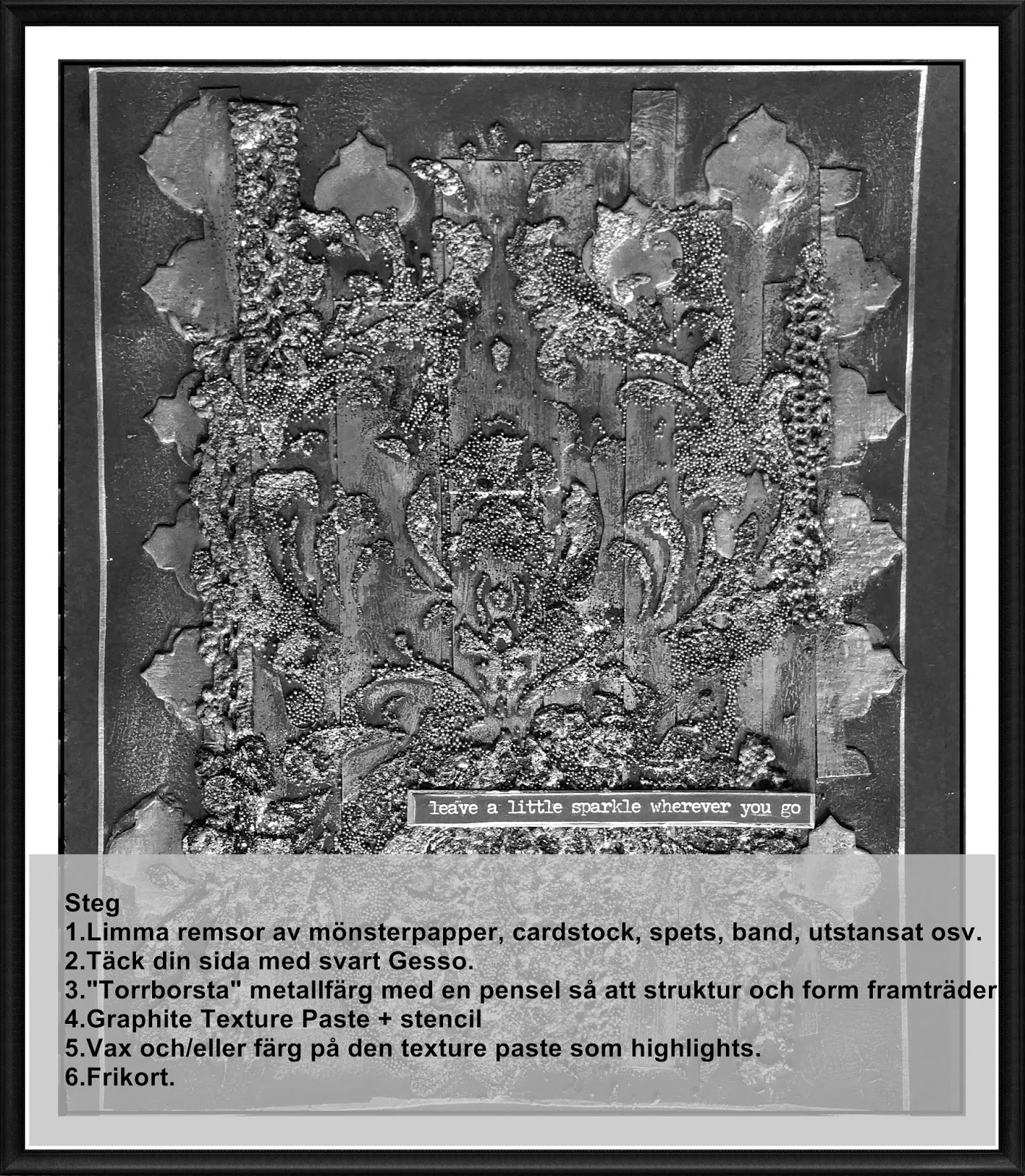 Min första sida skapade jag med mixed media teknik på svart Gesso. Mycket sparade "skatter" kom till användning. I det sista steget torrborstade jag alla målade dekorationer med vit akrylfärg/gesso för att få fram alla detaljer.